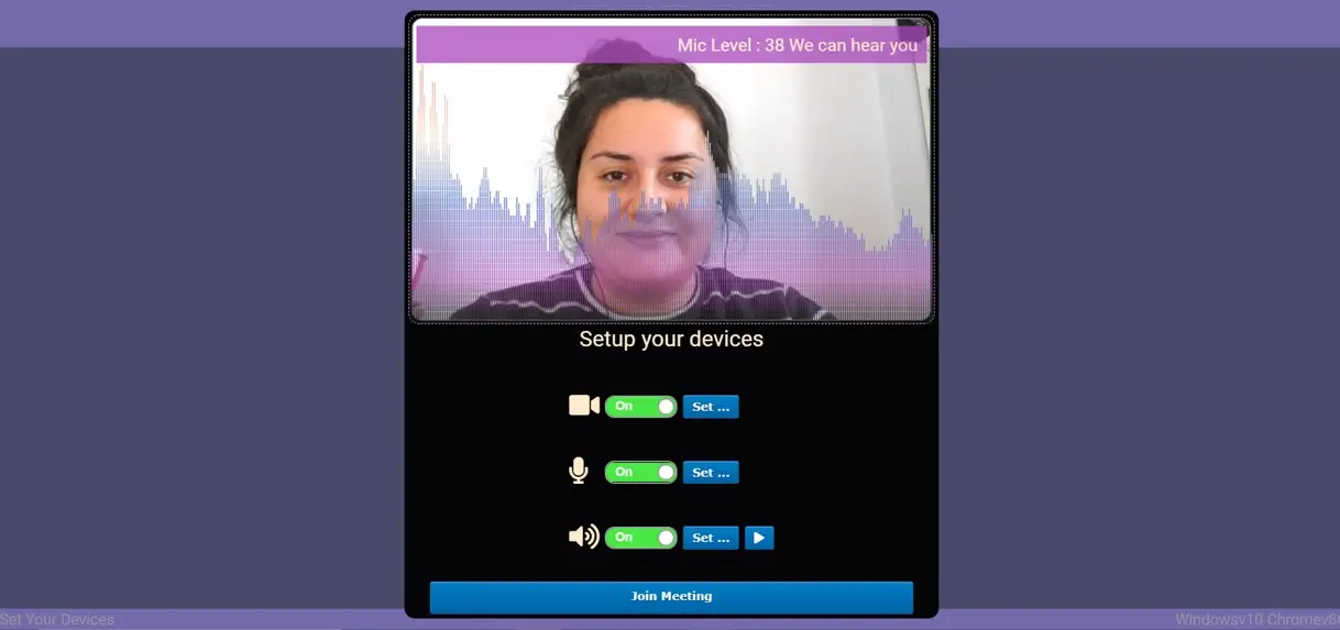 3. After making all your settings, you can join the conversation by clicking the "Join Meeting" button at the bottom. If you see your own image on the screen and see the 'We can hear you' statement at the top left it means there are not any problems with your camera and sound settings.
